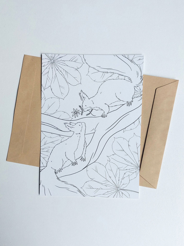 Met de INKLEURKAART EEKHOORNS wordt een kaartje versturen nog nét even leuker. Naast dat je op de achterkant van deze A5-kaart alle ruimte hebt voor een persoonlijke boodschap, kun je ook de voorkant helemaal naar jouw hand zetten. Ga aan de slag met potlood, stift en verf (of bijvoorbeeld lijm, stickers en glitters) en tover 'm om in een waar kunstwerk!